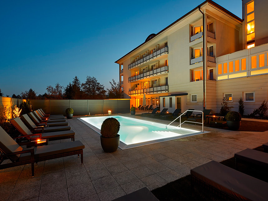 Im Spa- und Wellnessbereich des Hauses finden Sie auf insgesamt 600 m² Ruhe und Erholung. Mit Schwimmbad, verschiedenen Saunen, Ruhezonen, Sonnenterrasse, Erlebnisduschen und Eisbrunnen, Fitnessraum, Solarium sowie Behandlungsräumen und einer Partnerkabine ist alles für Ihre persönliche Auszeit vorhanden. Nutzen Sie auch die verschiedenen Gesundheits-, Fitness- und Präventionsprogramme, die durch kompetente Therapeuten, professionelle Trainer und Berater durchgeführt werden.