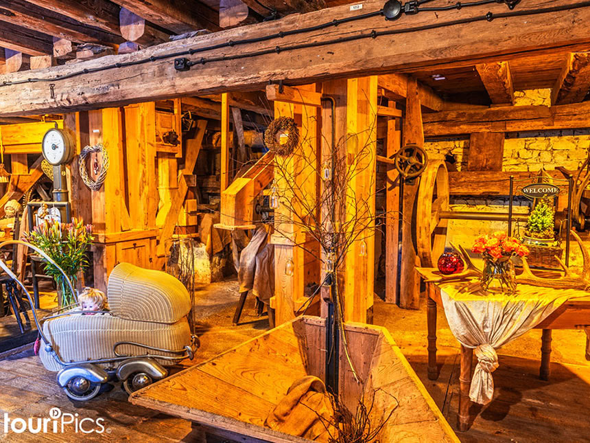 Gäste haben die Möglichkeit an einer Führung durch die Brennerei und über das gesamte Mühlengelände teilzunehmen, um mehr über das Verfahren zu lernen und einen selbstgebrannten Schnaps zu probieren. Die Getreidemühle des Hofs stammt aus dem 13. Jahrhundert und wird erst seit 1917 durch eine Turbine betrieben. Auch heute noch ist die Mühle in Betrieb, es werden vor allem Vollkornmehle hergestellt, die in der Mühlen-Bäckerei zum Einsatz kommen. Die Bäckerei mit den zwei Backöfen, die noch mit Holz beheizt werden, befindet sich in einem der vier Fachwerkhäuser. Hier wird noch Brot nach Omas Natursauerteigrezept hergestellt. Die fast 200 Jahre alte Ölmühle aus dem Kreis Heinsberg wird auch heute noch zur Herstellung von Raps-, Haselnuss- und Kürbiskernöl verwendet. Auch die Senfmühle kommt weiterhin zum Einsatz und es werden verschiedene Senfsorten aus den braunen und gelben Senfkörnern hergestellt. Gäste haben die Möglichkeit, dem Senfmüller über die Schulter zu schauen und die Produkte der Mühlen zu erwerben. Lassen Sie sich mitnehmen auf eine kulinarische Zeitreise. Bereits das Frühstücksbuffet wird zu einem historischen Highlight, denn es findet im Gewölbekeller statt und wird zu einem unvergesslichen Erlebnis.